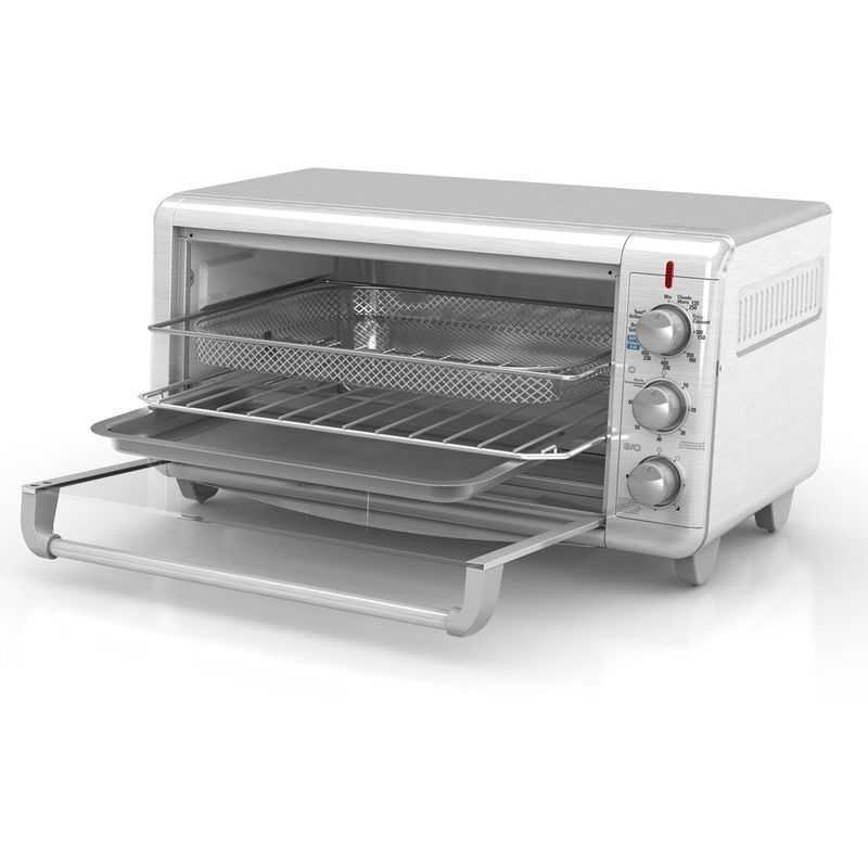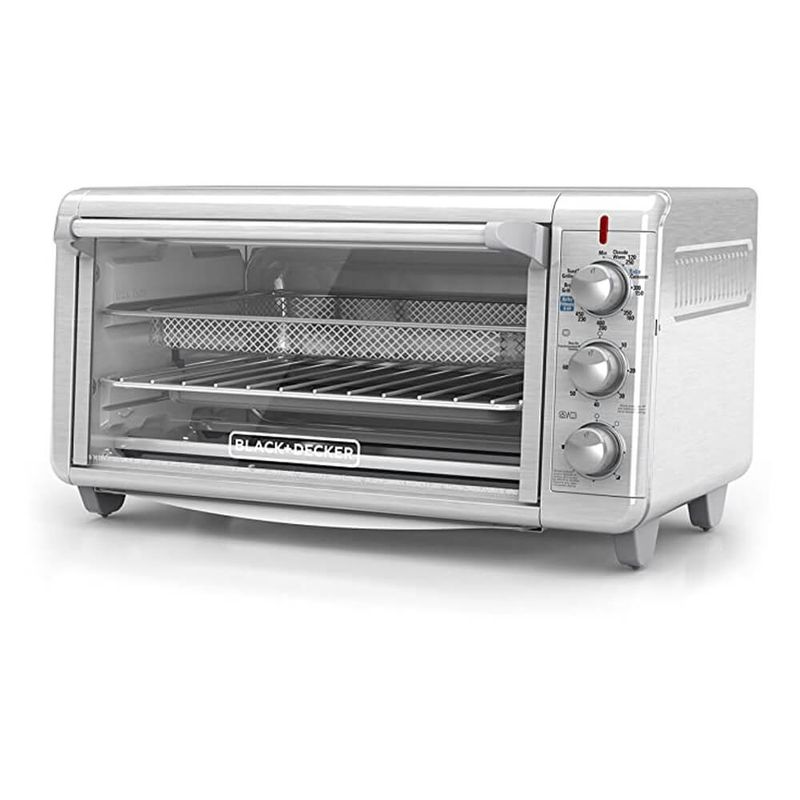 Horno Tostador Black & Decker BDTO3265XSSLA Con potencia de 1500 Watts, con 5 funciones: Freír con aire, Hornea, Tuesta, Dora, Mantiene Caliente. - 3 Perillas de Control - Interior extra ancho - Acomoda una bandeja para hornear de 9" x 13" - 8 Rebanadas de pan o una pizza de 12 "/ capacidad 30 litros - Cronómetro de 60 minutos - Opción de funcionamiento continuo - Bandeja para hornear - Bandeja para parrilla - Bandeja para freír - Bandeja de residuos removibles